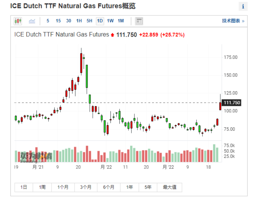 2/24日,普京宣稱在頓巴斯地區(qū)進(jìn)行特別軍事行動。受此影響,天然氣盤中迅速飆升,被視為“歐洲天然氣價格風(fēng)向標(biāo)”的荷蘭TTF天然氣期貨價格較前一個交易日暴漲25.72%,漲幅甚至一度超過35%。