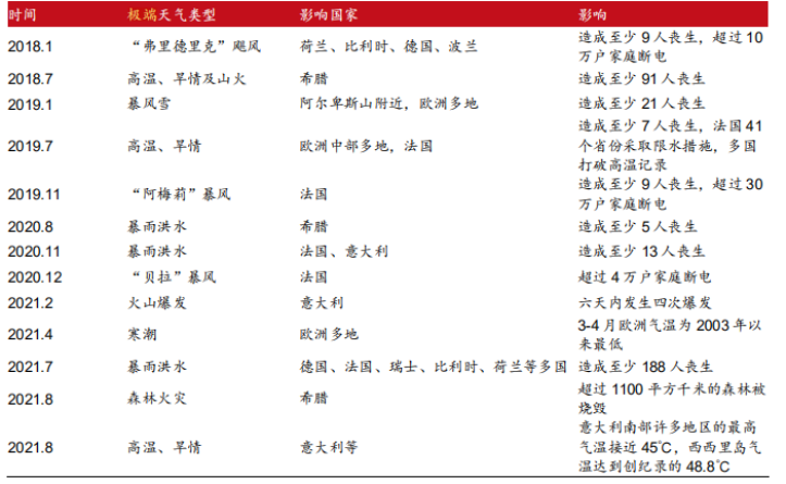 從上圖還可以看出歐洲的新能源發(fā)電占據(jù)了23.79%的比例。上文提到由于光伏、風(fēng)電等新能源發(fā)電均存在發(fā)電量不穩(wěn)定的問題。這時候天然氣便作為備用能源,通過地下儲氣庫和LNG接收站兩種方式來進(jìn)行調(diào)峰。這也從一個層面說明了天然氣在歐洲能源結(jié)構(gòu)中的重要性。此外,環(huán)境問題日益嚴(yán)重,極端季候情況開始頻發(fā)。產(chǎn)生的影響是一方面對天然氣的需求再度上升,另一方面環(huán)境逐步惡化使得碳減的需求更加迫在眉睫。故此,歐盟將2030年氣候減排目標(biāo)由40%提高至55%,加速實現(xiàn)碳中和。以德國為例,提出在2045年實現(xiàn)碳中和,比原計劃提前五年。但是在提速后碳配額總供應(yīng)明顯不足,使得碳價攀升至每噸50歐元左右,電力公司大力推進(jìn)煤改氣,大大加劇了天然氣的需求。此外,歐洲開始全力發(fā)展新能源的同時對能源結(jié)構(gòu)進(jìn)行了調(diào)整。