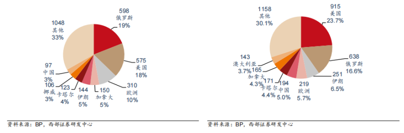 而核電是歐洲發(fā)電量最大的技術(shù)手段之一,棄核意味著需要使用其他能源來滿足電力的缺口,這無疑再度加重了天然氣的需求。目前歐洲天然氣的儲存庫容量已不足75%,是十多年來的同期最低水平。歐盟委員會的數(shù)據(jù)顯示,該地區(qū)四分之三的天然氣消費依靠從國外進(jìn)口,無法自供天然氣加上能源結(jié)構(gòu)調(diào)整出現(xiàn)了極度緊缺的狀況。全球天然氣供應(yīng)格局過去十年受頁巖油革命推動,新增了美國這一大供給。美國、俄羅斯和伊朗是目前主要天然氣生產(chǎn)地,占比分別為23.7%/16.5%/6.5%。左圖:2010年全球天然氣供應(yīng)格局(Bcm)