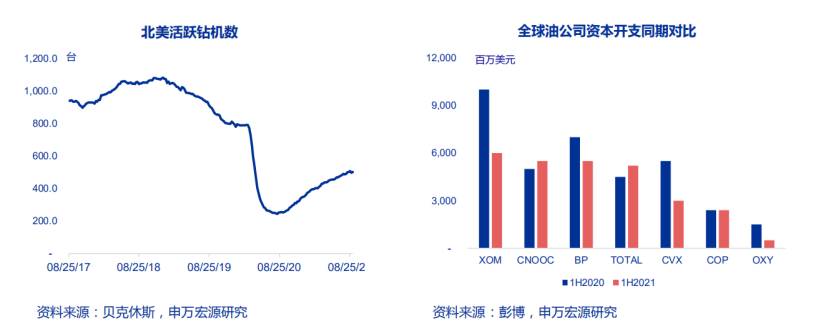右圖:2020年全球天然氣供應(yīng)格局(Bcm)相比快速回升的需求,全球天然氣供給恢復(fù)速度相對緩慢。根據(jù)OPEC數(shù)據(jù)所示,2021年2季度美國天然氣產(chǎn)量環(huán)比增長5.4%,俄羅斯天然氣產(chǎn)量環(huán)比增長1.9%,都沒回到2019年高峰水平。二季度及三季度全球產(chǎn)量恢復(fù)速度依然緩慢。雖然油氣價格全面復(fù)蘇,但全球上游油氣公司投資依然謹(jǐn)慎。一方面,疫情對行業(yè)的沖擊還未褪去;另一方面,碳中和極大影響了企業(yè)的投資意愿。根據(jù)Haynes and Boone律所統(tǒng)計,受疫情沖擊,2020年美國共有46家上游油公司和61家油服公司申請破產(chǎn),創(chuàng)2016年油價低谷以來新高。行業(yè)出清后,頁巖氣產(chǎn)能需要較長時間來恢復(fù),雖然油氣價格已經(jīng)回到2019年水平,但北美活躍鉆機(jī)數(shù)仍在低位緩慢爬升。高昂的費用也是牽制著頁巖氣開采的原因,頁巖氣的開發(fā)成本相較于常規(guī)天然氣要更高。根據(jù) Rystad Energy在2018年發(fā)布的數(shù)據(jù),折合原油價格推算,北美頁巖的盈虧平衡成本約為60美元/桶;15年-20年原油價格長期低于60美元,故而大部分企業(yè)不會儲備產(chǎn)能,資本開支有限。