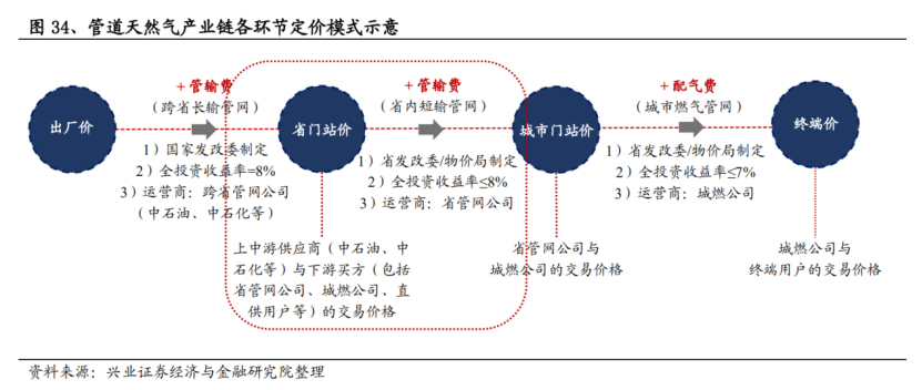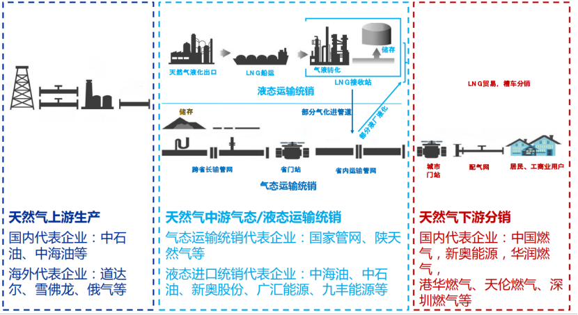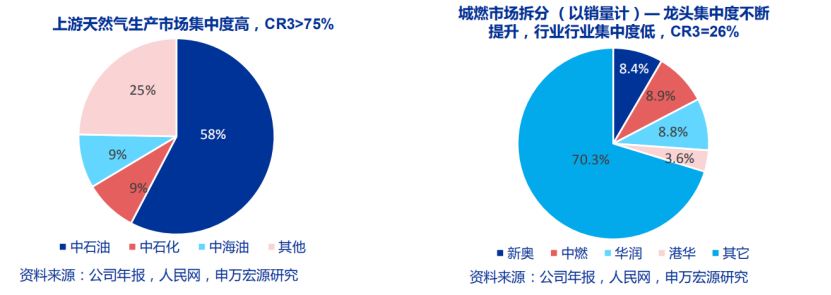 在產(chǎn)業(yè)高景氣度的前提下,尋求投資機(jī)會的最好方法就是對產(chǎn)業(yè)鏈進(jìn)行分析。按產(chǎn)業(yè)鏈條觀察,天然氣可以分為上游:天然氣生產(chǎn)、中游運(yùn)輸、下游分銷三個部分從上游來看:具備市場集中度高的特點。國有“三桶油”的CR3>75%,民營企業(yè)主要集中于非常規(guī)天然氣生產(chǎn),以亞美能源(02686.HK)和藍(lán)焰控股(000968.SZ)為代表。在鏈條中游:跨省管網(wǎng)主要由國家管網(wǎng)運(yùn)營,省際管網(wǎng)由地方能源國企運(yùn)營,輸氣價格受政府監(jiān)管。而在下游一端的格局,特許經(jīng)營權(quán)保護(hù)下,城燃劃城而治,行業(yè)集中度低,終端售價由當(dāng)?shù)匚飪r局制定。由于天然氣存在著公用屬性,出廠后價格受到發(fā)改委/物價局管控,這就導(dǎo)致了在天然氣價格上漲的時候下游利潤不如上游。