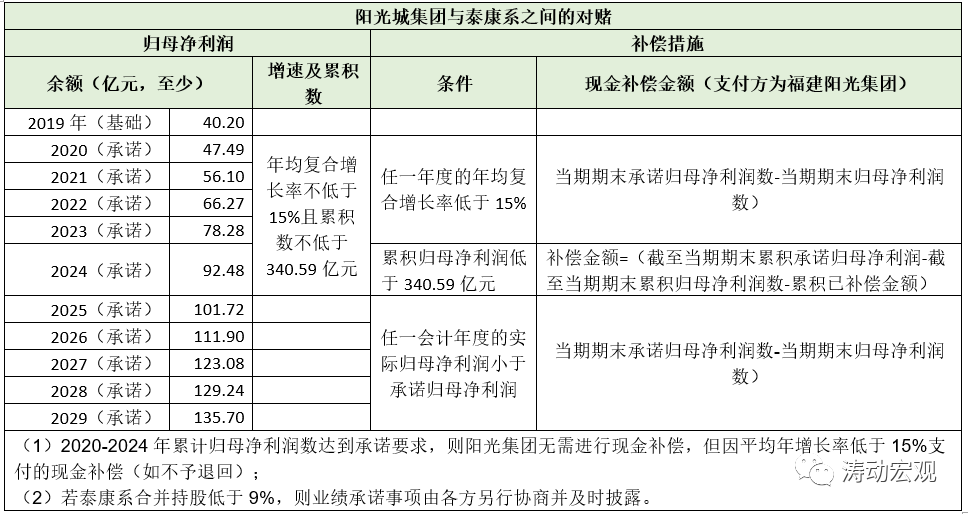 (四)與融資端與銷售端所面臨的壓力相比,福建陽光集團與泰康系之間的業(yè)績對賭同樣值得關(guān)注,這對于福建陽光集團來說,是一筆不小的隱形支出。在政策環(huán)境沒有明顯改善以及大股東(福建陽光集團)與二股東(泰康系)之間的角逐可能是另一個不確定性因素。