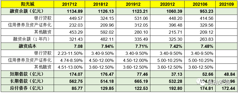 1、除三道紅線中僅有一道踩上紅線外(即剔除預(yù)收款后的資產(chǎn)負(fù)債率),2018年以來,陽光城體系的融資余額呈現(xiàn)緩慢下降的趨勢性特征,由2017年的1135億元降至2021年6月底的953.23億元,重回千億元以下。其中,信托、融資租賃等其他融資規(guī)模下降較多,這表明其債務(wù)指標(biāo)確有呈現(xiàn)出一定好轉(zhuǎn)的跡象。