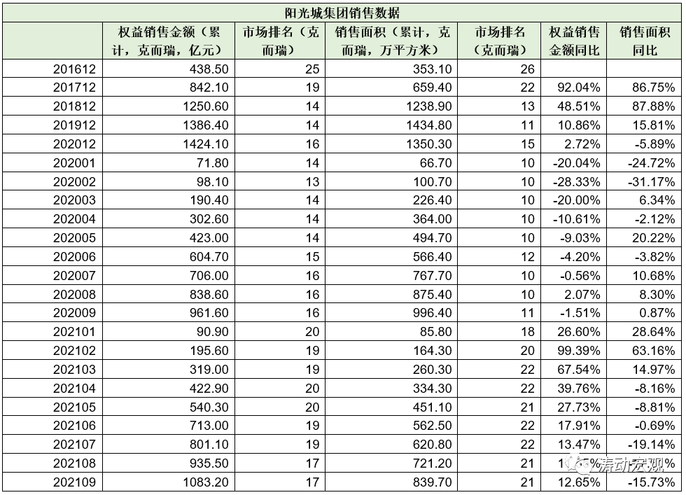 2、2016年以來,陽光城的銷售情況有了質(zhì)的飛躍,具體看2016年權(quán)益銷售金額僅為438.50億元(排名全國第25位),2017年權(quán)益銷售金額達到842.10億元(排名全國第19位)、2018年直接躍升至1250.60億元(排名全國第14位),2019-2020年的權(quán)益銷售金額則分別為1386.40億元和1424.10億元。數(shù)據(jù)上也能看出,2019-2021年陽光城的銷售增長有所放緩。