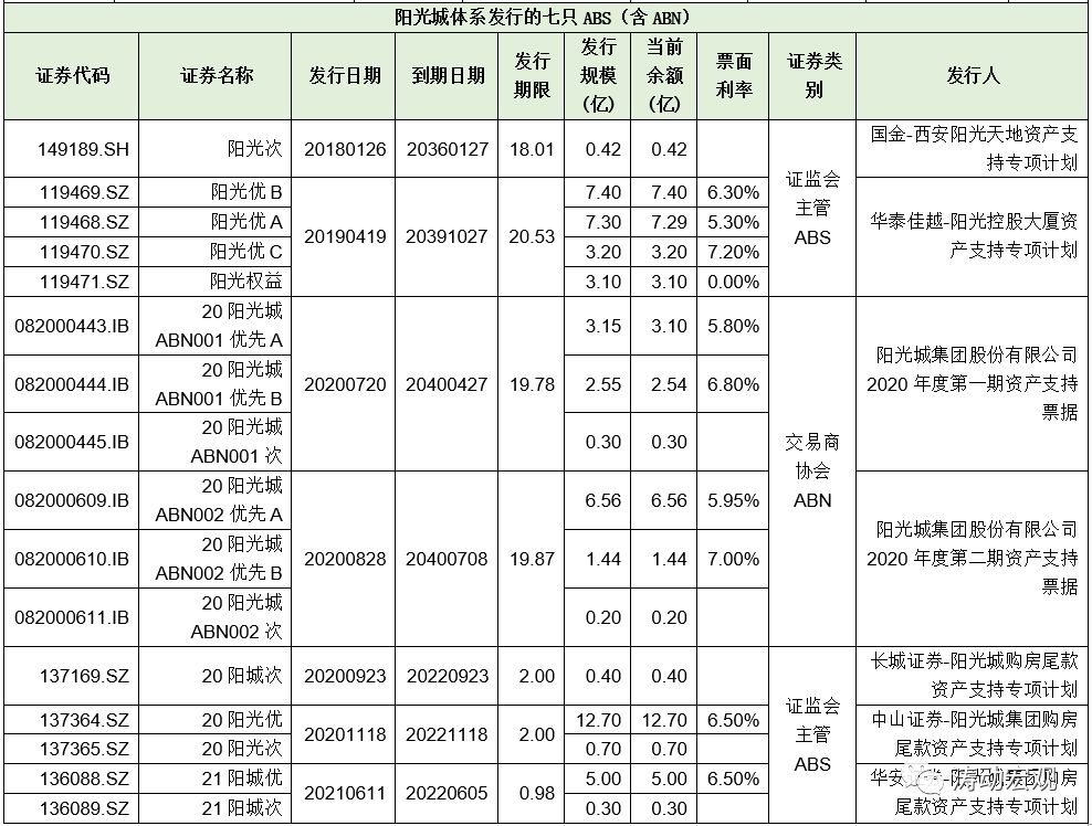 2、七只ABS(含ABN,陽光城集團發(fā)行):余額合計54.65億元人民幣