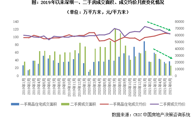 事實(shí)上,對于二手房價的管控,上海并非“第一個吃蟹人”,深圳、寧波、成都、西安都在今年出臺了相關(guān)政策來打擊“二手房價格虛高、投機(jī)炒作”等行為。為了更好的測度上海新政落地的影響,下面我們就以出臺政策最早,和上海最為類似的一線城市深圳為例,來具體看看其在“二手房指導(dǎo)價”出臺對樓市的影響。2月28日,深圳將全市3595個住宅小區(qū)作為區(qū)域網(wǎng)格單元,以二手住宅網(wǎng)簽價格為基礎(chǔ),參考周邊一手住房價格,落實(shí)參考價格制度;旨在以二手住房交易信息公開透明為主要抓手,引導(dǎo)市場理性交易,穩(wěn)定市場預(yù)期。而政策實(shí)施的效果也可謂“立竿見影”:據(jù)CRIC監(jiān)測數(shù)據(jù),自深圳新政發(fā)布以來,二手房成交量節(jié)節(jié)下滑,2021年6月單月僅成交26萬平方米,處于近年來歷史低位;上半年整體二手房成交量僅為257萬平方米,同比降幅達(dá)36%,可見新政對二手房市場的“殺傷力”比“新冠疫情”還要猛烈。二手房成交均價如是,在“指導(dǎo)價”出臺后,整體成交均價穩(wěn)步回落,至6月末已低于新房成交價格,“一二手倒掛”不復(fù)存在。新房市場熱度也有減退趨勢,自3月以來成交量保持下行,不過上半年總體成交量還是顯著好于去年同期,成交均價延續(xù)小幅上行,市場表現(xiàn)趨于平穩(wěn)。