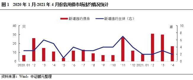信用風(fēng)險事件回顧:2021年4月份發(fā)生信用風(fēng)險事件24次,涉及16家發(fā)行人。其中,首次違約的主體有2家。具體看首次違約債券特征:4月首次違約債券17只,涉及12家發(fā)行人。從違約類型看,首次因觸發(fā)交叉保護(hù)條款而違約的債券有5只,其他均為實質(zhì)性違約。從違約事件看,除交叉違約外,12只債券均為本金利息項違約。從債券類型看,中期票據(jù)6只,公司債5只,私募債3只,短期融資券2只,定向工具1只。從企業(yè)性質(zhì)看,2家新增違約主體中同濟堂為民營企業(yè),紫光通信為中央國有企業(yè)。從上市情況看,本月新增違約主體均為非上市公司。從處置方式看,“18華聞傳媒MTN001”在2020年10月與持有人達(dá)成展期兌付協(xié)議,此外,華夏幸福、永煤控股和河南能源、鴻達(dá)興業(yè)繼續(xù)通過持有人會議與持有人達(dá)成延期兌付協(xié)議。