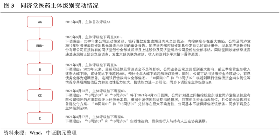 2021年4月25日,同濟堂醫(yī)藥有限公司(簡稱“同濟堂醫(yī)藥”)兩只存續(xù)債券發(fā)生違約,違約規(guī)模合計約4.6億元。同濟堂,僅在2018年發(fā)行了兩只公募公司債,2019年欲發(fā)行債券,后公告延期發(fā)行后再無進(jìn)展,當(dāng)年共有3.13億元銀行借款發(fā)生違約,風(fēng)險已顯露。2020年8月,公司主體等級由AA被調(diào)降至BBB-,并列入觀察名單。