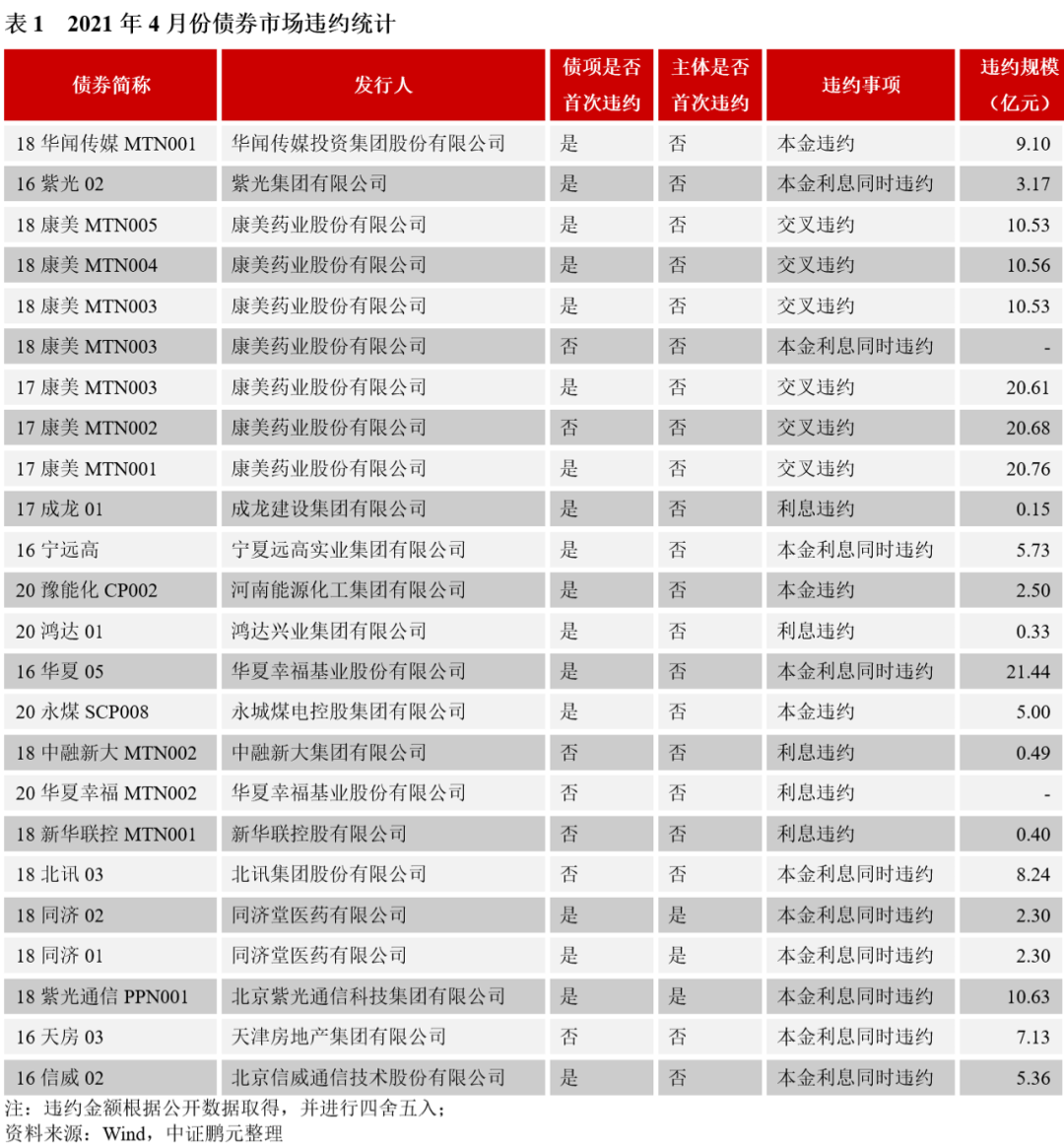 4月首次違約債券17只,涉及12家發(fā)行人。從違約類型看,首次因觸發(fā)交叉保護(hù)條款而違約的債券有5只,其他均為實質(zhì)性違約。從違約事件看,除交叉違約外,12只債券均為本金利息項違約。從債券類型看,中期票據(jù)6只,公司債5只,私募債3只,短期融資券2只,定向工具1只。從企業(yè)性質(zhì)看,2家新增違約主體中同濟堂為民營企業(yè),紫光通信為中央國有企業(yè)。從上市情況看,本月新增違約主體均為非上市公司。從處置方式看,“18華聞傳媒MTN001”在2020年10月與持有人達(dá)成展期兌付協(xié)議,此外,華夏幸福、永煤控股和河南能源、鴻達(dá)興業(yè)繼續(xù)通過持有人會議與持有人達(dá)成延期兌付協(xié)議。