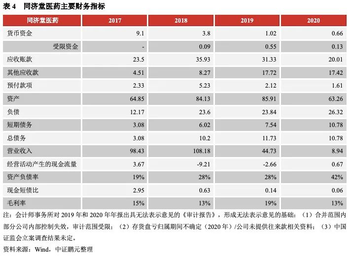 第一,擴張激進(jìn),并購失敗。同濟堂醫(yī)藥在2018年并購了龍海新藥(河北民營醫(yī)藥流通企業(yè)前列)及廣東坤和兩家公司,后因管理分歧,2019年公司將溢價收購的龍海新移出合并報表,轉(zhuǎn)讓相應(yīng)55%的股權(quán),使得當(dāng)年商譽減少99.69%。第二,應(yīng)收款項占用資金嚴(yán)重。行業(yè)應(yīng)收預(yù)付款規(guī)模較高,尤其是中小區(qū)域性醫(yī)藥物流企業(yè),在行業(yè)競爭加大的情況下,會給予下游公司較寬的信用政策,企業(yè)預(yù)付供應(yīng)商貸款上升,從而使得資金壓力上升,后期回收風(fēng)險較高。同濟堂醫(yī)藥的應(yīng)收款項規(guī)模占比高,形成嚴(yán)重的資金占用。2019年末,同濟堂控股通過供應(yīng)商及其他非關(guān)聯(lián)方等方式占用同濟堂醫(yī)藥資金 10.47 億元,令其他應(yīng)收款大幅增加,同濟堂控股承諾將在2020-2022 年期間以現(xiàn)金方式分批償還全部占用資金本金及利息。第三,償債可用資金大幅下降。2018年公司對客戶采取寬信用政策導(dǎo)致應(yīng)收款項、預(yù)付及采購和醫(yī)院保證金支出增加,導(dǎo)致經(jīng)營活動凈現(xiàn)金流由正轉(zhuǎn)負(fù)。2019年(即業(yè)績對賭期3年完成后)公司更新代理/渠道業(yè)務(wù)模式,不再承擔(dān)向客戶轉(zhuǎn)讓商品的主要風(fēng)險,按凈額法確認(rèn)收入[3],上述業(yè)務(wù)模式和收入確認(rèn)方式的變化令其醫(yī)藥批發(fā)收入同比大幅下降。此外,非受限資金規(guī)模逐年遞減。