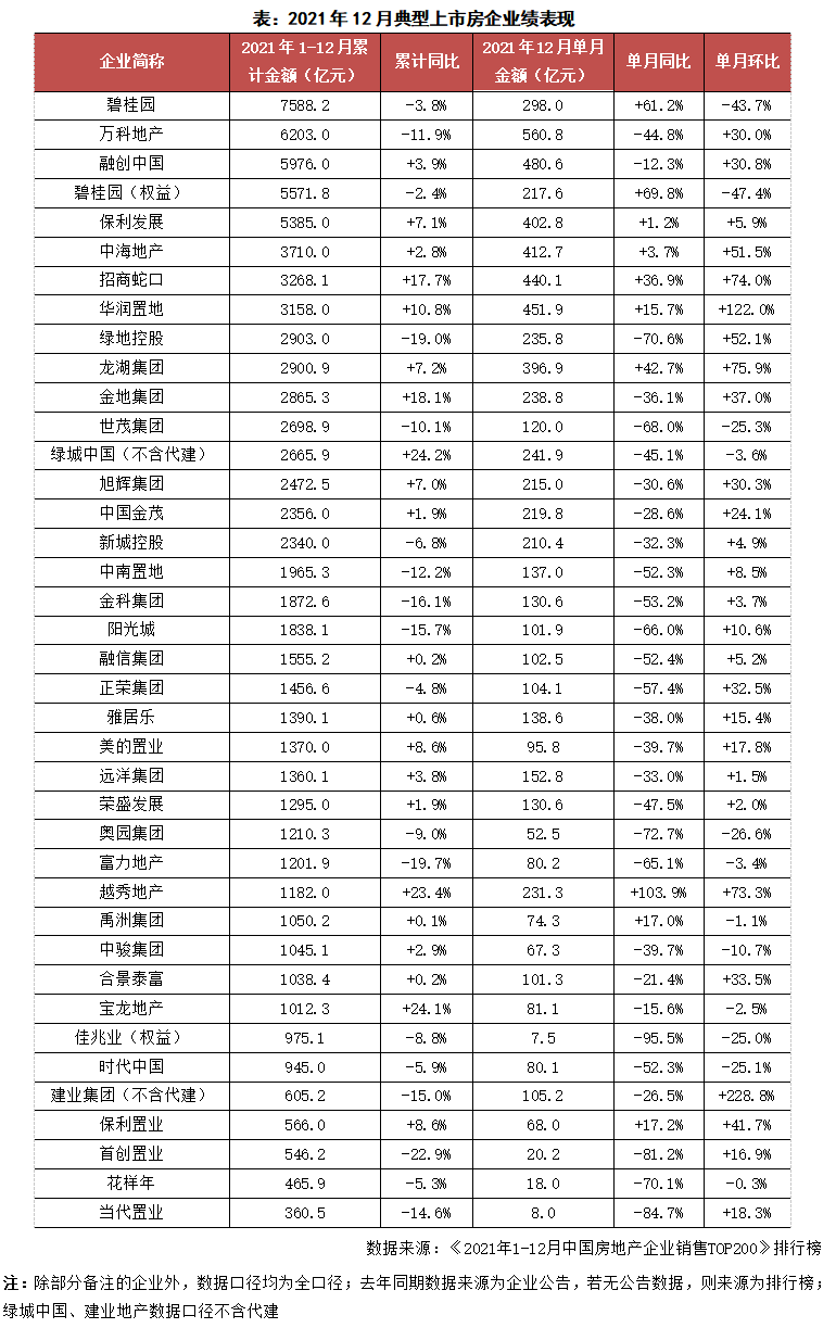 從企業(yè)表現(xiàn)來(lái)看,38家典型上市房企中,12月超7成房企單月業(yè)績(jī)同比降低,其中近半數(shù)房企同比降幅大于40%,9家房企單月業(yè)績(jī)同環(huán)比雙降。僅碧桂園、招商、華潤(rùn)、龍湖、越秀等實(shí)現(xiàn)了較高的單月業(yè)績(jī)同比增長(zhǎng)。截至12月末,38家典型上市房企中有18家企業(yè)累計(jì)業(yè)績(jī)同比負(fù)增長(zhǎng),銷(xiāo)售規(guī)模負(fù)增長(zhǎng)的企業(yè)數(shù)量較2020年有明顯提升。