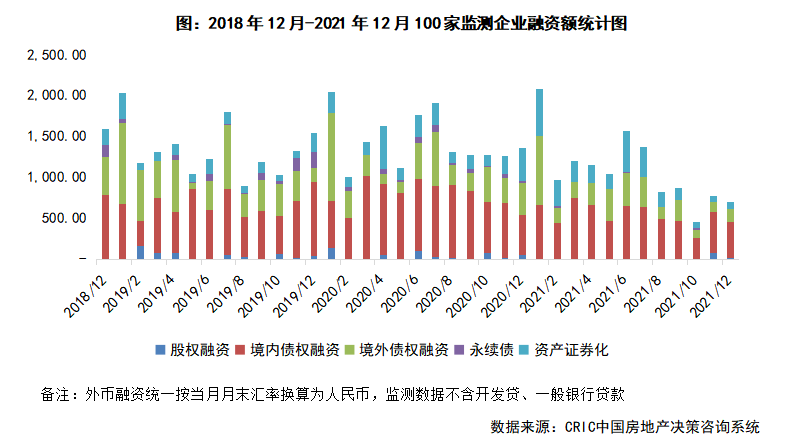 融資總量:2021年12月100家典型房企的融資總量為702.21億元,環(huán)比下降10%,同比下降48%。房企融資“冰凍”解封雖得以推進(jìn),但當(dāng)前機(jī)構(gòu)融資仍是偏向財(cái)務(wù)狀況較好的房企,12月融資量仍屬于年內(nèi)低位。從融資結(jié)構(gòu)來(lái)看,境內(nèi)債權(quán)融資434.05億元,環(huán)比下降13.5%,同比下降11.1%;境外債權(quán)融資166.52億元,環(huán)比上升35.0%,同比下降58.1%;本月資產(chǎn)證券化融資82.57億元,環(huán)比上升4.9%,同比下降79.6%。而全年來(lái)看,全年融資量13038億元,同比下降26%,近五年來(lái)融資量首次出現(xiàn)負(fù)增長(zhǎng),同時(shí)達(dá)到五年來(lái)最低點(diǎn)。其中,2021下半年以來(lái),受房企商票違約、債券違約等多方面的影響,房企的融資量8月以后均不足千億元。