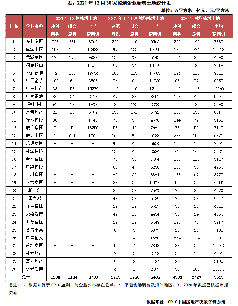 本月上海、北京、杭州等熱門(mén)一二線城市集中供地,典型房企本月投資力度有所反彈,量?jī)r(jià)齊升,投資規(guī)模與9月相當(dāng)。本月30家典型房企新增土儲(chǔ)總建面1298萬(wàn)平方米,環(huán)比上升3.9倍;新增土地成交價(jià)格1134億元,環(huán)比上升5.4倍。平均樓板價(jià)8739元/平方米,與上月相比上升31%。得益于12月集中供地密集開(kāi)拍,投資聚焦一二線城市,拉高平均樓板價(jià)。