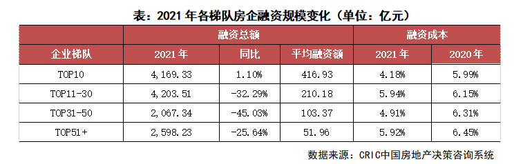 企業(yè)表現(xiàn):本月融資總量最高的企業(yè)為華潤(rùn)置地,融資總量約83.61億元,主要是發(fā)行了25億元的公司債,此外進(jìn)行了多筆境外銀行貸款,還發(fā)行了資產(chǎn)證券化產(chǎn)品。從企業(yè)梯隊(duì)來(lái)看,2021年月平均額最大為T(mén)OP10房企,平均融資額416.93億元,融資總額同比上升1.10%,唯一一個(gè)同比上漲的梯隊(duì);TOP31-50梯隊(duì)融資總額同比降幅最大,降幅達(dá)到45.03%。成本來(lái)看,4個(gè)梯隊(duì)均同比下降,其中TOP10梯隊(duì)降幅最大達(dá)到1.81pct,其融資成本也最低,為4.18%。