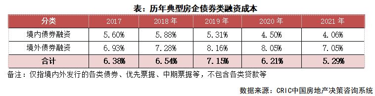 融資成本:2021年100家典型房企新增債券類1融資成本5.29%,同比下降0.93pct,其中境外債券融資成本達(dá)7.05%,下降1.01 pct,境內(nèi)債券融資成本4.06%,下降0.43 pct。單月來(lái)看,12月房企融資成本4.52%,環(huán)比上升0.72pct,同比下降2.40pct。其中境外融資成本7.02%,環(huán)比下降6.48pct;境內(nèi)融資成本3.73%,環(huán)比上升0.31 pct,同比下降1.47pct。境內(nèi)發(fā)債的企業(yè)中,融資利率在2.98%-6.80%間,政策的密集發(fā)聲下房企發(fā)債有所松綁,更多的企業(yè)可以進(jìn)行發(fā)債,是以成本區(qū)間有所擴(kuò)大。