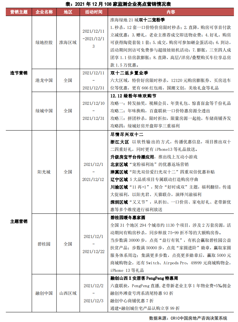 臨近年末,房企把握雙十二和年終節(jié)點(diǎn),以造節(jié)和主題活動(dòng)為主要載體推出營(yíng)銷(xiāo)活動(dòng)。從市場(chǎng)來(lái)看,12月市場(chǎng)略有回升,29個(gè)重點(diǎn)監(jiān)測(cè)城市商品住宅成交面積環(huán)比增長(zhǎng)16%,同比下降35%。其中,一線城市穩(wěn)步修復(fù),成交環(huán)比增長(zhǎng)6%,同比仍下降30%。25個(gè)二、三線城市企穩(wěn)回升,環(huán)比增長(zhǎng)19%、同比仍跌36%。從營(yíng)銷(xiāo)來(lái)看,本月房企營(yíng)銷(xiāo)仍然積極,臨近年末,碧桂園、綠地、綠城、融創(chuàng)等一眾房企紛紛推出了雙十二和年終營(yíng)銷(xiāo)活動(dòng),形式上仍然以造節(jié)和主題活動(dòng)為主。