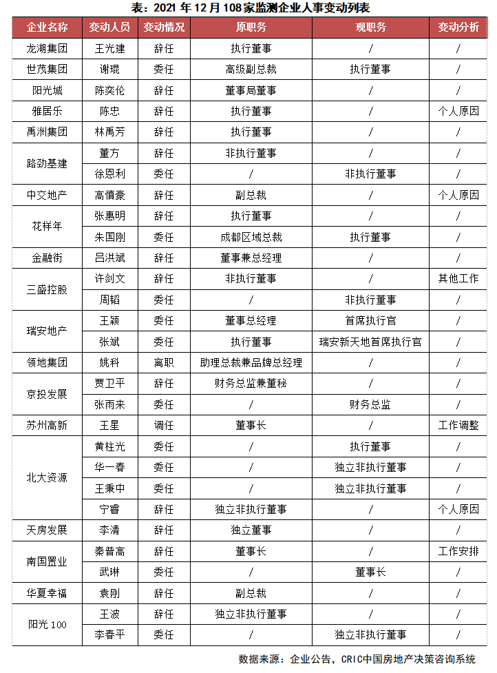 12月,房企高層人事動(dòng)態(tài)信息數(shù)量較前一月基本持平,從108家監(jiān)測(cè)企業(yè)的人事變動(dòng)情況來(lái)看,房企對(duì)組織架構(gòu)的調(diào)整仍在繼續(xù),管理層的重整仍在深化,加之年終節(jié)點(diǎn),高層大范圍變動(dòng)時(shí)有發(fā)生。