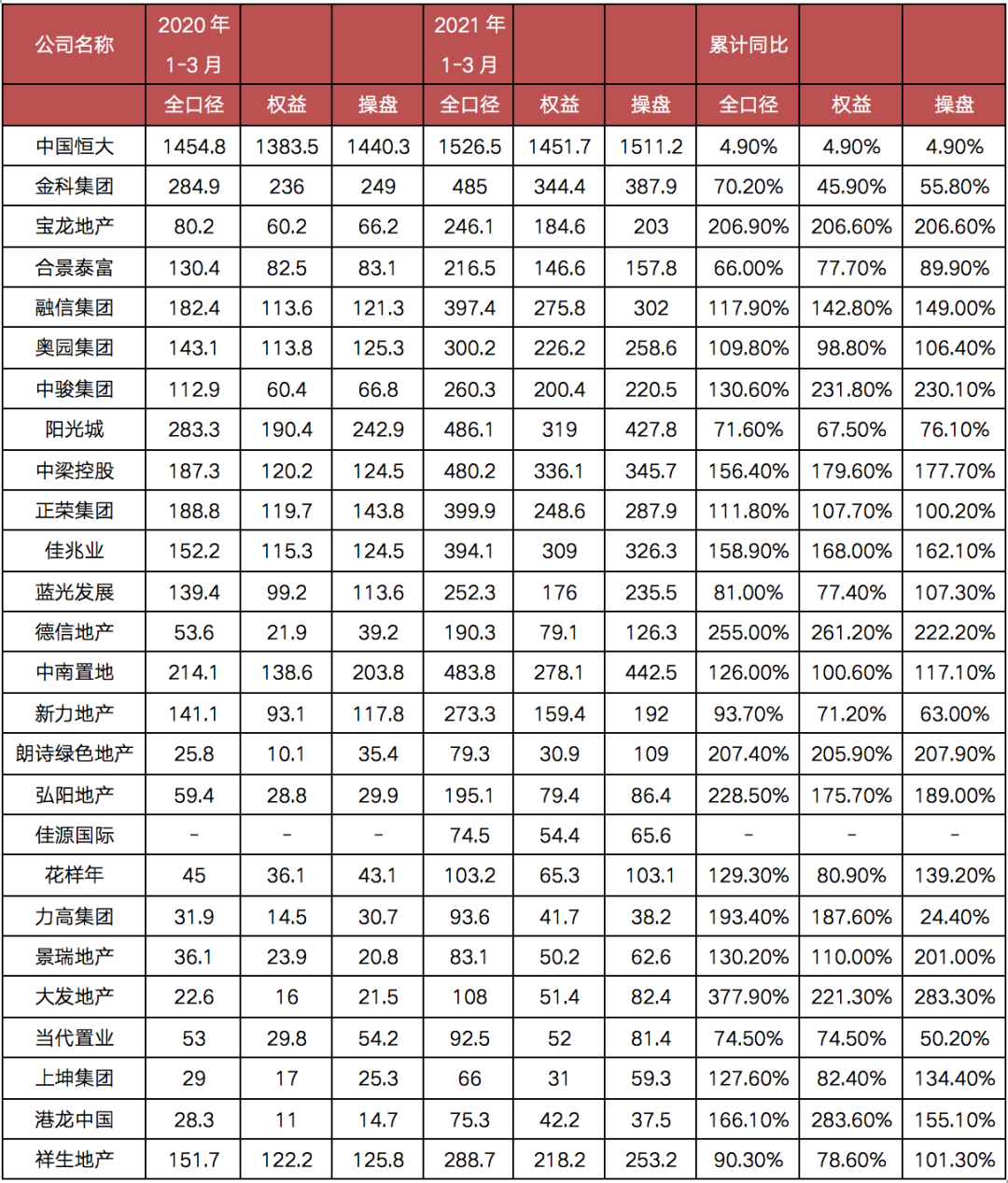 根據(jù)克而瑞證券統(tǒng)計(jì)數(shù)據(jù)顯示,2021年1-3月,26家“B”評(píng)級(jí)及樣本房企全口徑銷(xiāo)售額累計(jì)同比增速均值約為139.1%(除恒大),約有三分之二的房企實(shí)現(xiàn)銷(xiāo)售翻倍。此外,26家“B”評(píng)級(jí)及樣本房企權(quán)益銷(xiāo)售金額和操盤(pán)金額平均漲幅均超過(guò)了130%。究其原因,主要是去年同期受疫情沖擊,房地產(chǎn)供應(yīng)停擺而造成的銷(xiāo)售低基數(shù)影響。