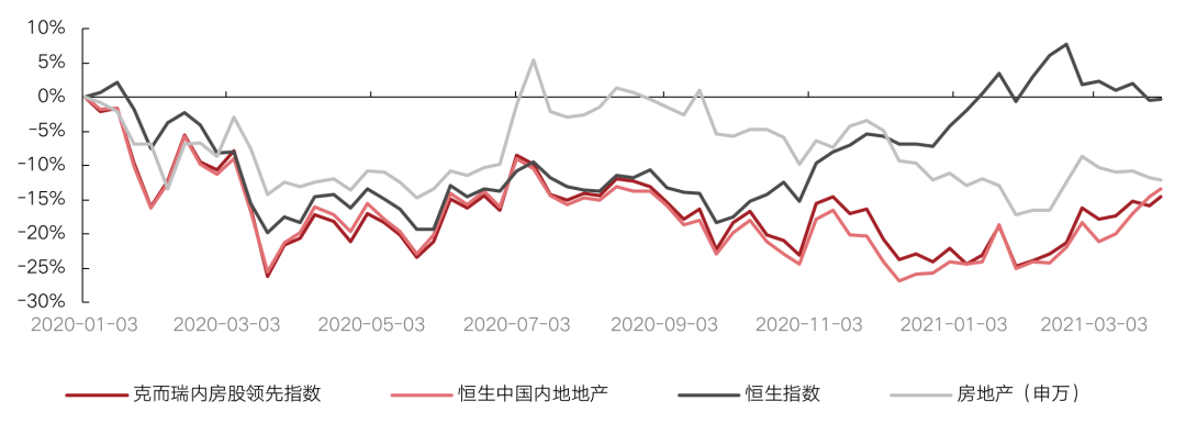 圖:克而瑞內(nèi)房股領(lǐng)先指數(shù)及恒生中國(guó)內(nèi)地地產(chǎn)指數(shù)走勢(shì)