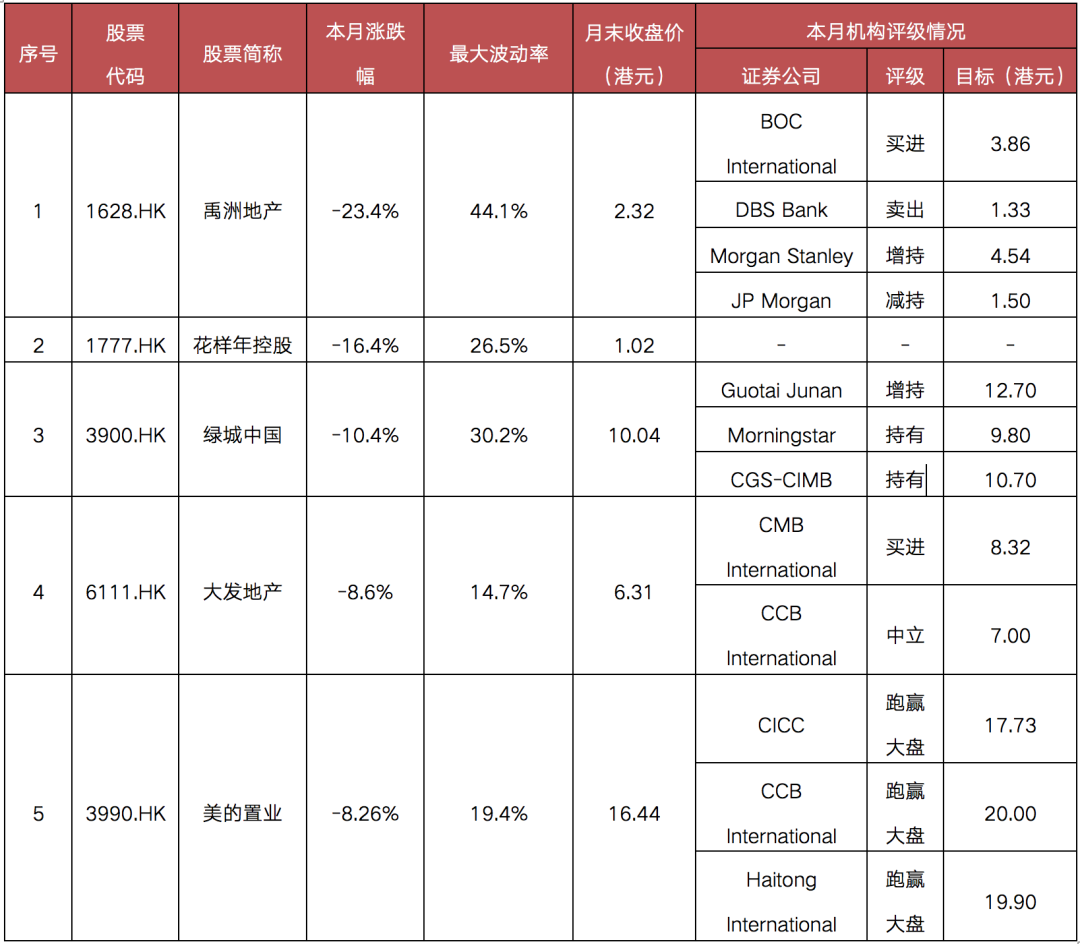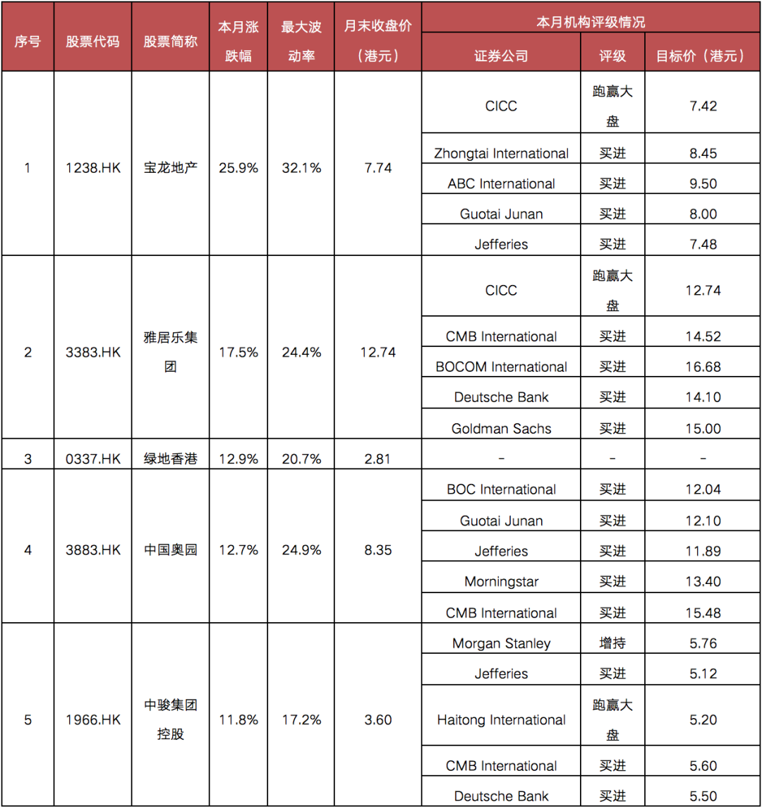 3月個(gè)股整體表現(xiàn)出色,漲幅TOP5房企分別為寶龍地產(chǎn)、雅居樂(lè)、綠地香港、中國(guó)奧園和中駿控股,平均上漲16.16%,較2月均值有所下滑;其中,寶龍地產(chǎn)漲幅達(dá)25.9%,領(lǐng)漲樣本房企,雅居樂(lè)和綠地香港緊隨其后。