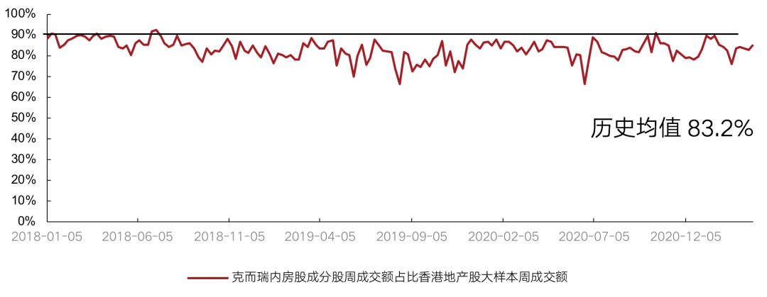 從成交額看,3月克而瑞內(nèi)房股領(lǐng)先指數(shù)成交額占香港地產(chǎn)股大樣本的成交額比值總體較上月有所回升。3月該指數(shù)成交額占比周均值83.9%,高于歷史均值83.2%,高于上月周均值81.7%。