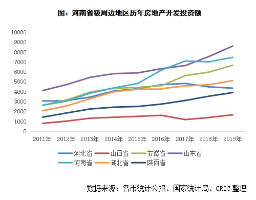 從房地產(chǎn)發(fā)展體量上來看,河南省2019年房地產(chǎn)開發(fā)投資額7465億元,全國各地區(qū)排名第五,房地產(chǎn)市場整體體量較大,同時(shí)同周邊6個(gè)接壤的省份比較來看,河南僅次于山東省,在中部地區(qū)中屬于領(lǐng)先地位。反映到最終的商品房銷售額來看,2019年河南省的商品房銷售額9010億元,全國各地區(qū)排名第六,與周邊接壤的省份相比,僅次于山東省。