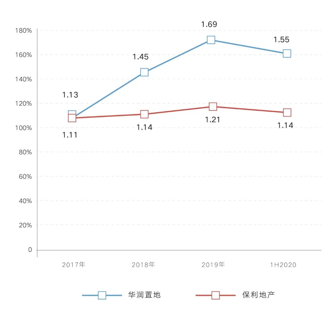 過去,頭部房企在規(guī)模化擴張過程中,傾向于借助預(yù)收賬款撬動企業(yè)經(jīng)營杠桿,以達到滿足經(jīng)濟資金需求和優(yōu)化財務(wù)指標(biāo)的目的,以華潤、保利為例,近年來預(yù)售賬款債務(wù)比持續(xù)提升,一定程度上達到了財務(wù)杠桿穩(wěn)健的目標(biāo)。