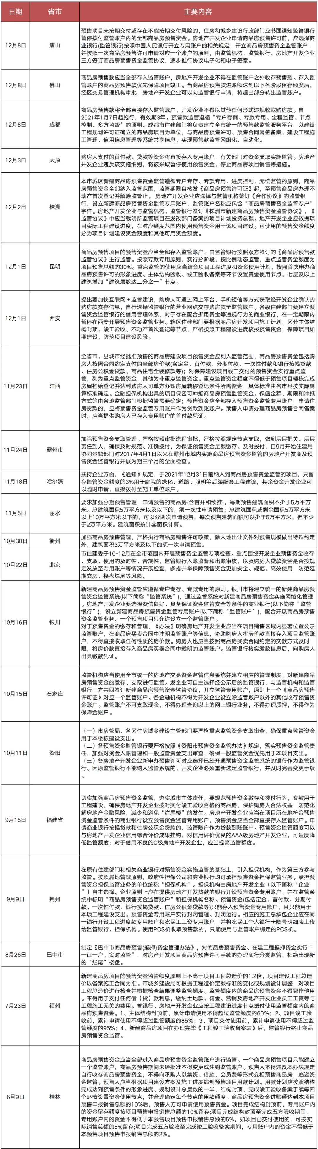 預(yù)售資金監(jiān)管政策的部分省市及內(nèi)容