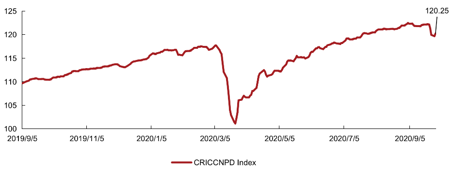 為了更好地展示房企融資的市場表現(xiàn),克而瑞委托倫敦證券交易所集團(LSEG)的全資子公司:富時羅素經(jīng)過嚴格篩選,挑選出具有代表性的中資房地產(chǎn)美元債進行編制了克而瑞中國地產(chǎn)債券領(lǐng)先指數(shù)。截止至2020年9月29日,該指數(shù)相比9月21日高點小幅回調(diào)至120.05,中資地產(chǎn)美元債在一季度疫情后,隨著二季度的復(fù)工復(fù)產(chǎn),房地產(chǎn)行業(yè)快速復(fù)蘇,美元債的市場表現(xiàn)也有明顯的回彈,近期呈現(xiàn)穩(wěn)健上行的態(tài)勢。