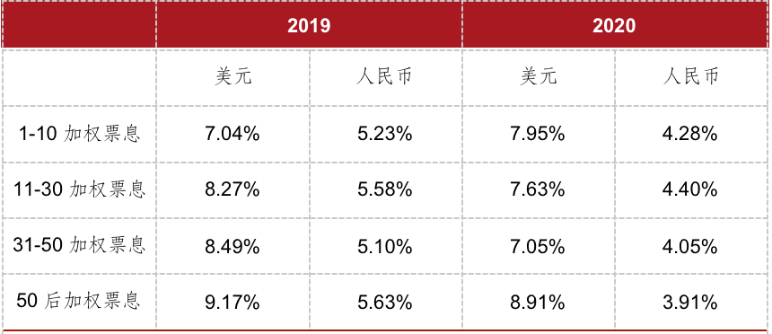 2020年前8月,前十發(fā)債集中度提升,人民幣債加權(quán)票息下降明顯。與銷售業(yè)績集中度提升的方向一致,資金向頭部房企集中以規(guī)避中小房企在調(diào)控中存在的各類不確定性風(fēng)險。