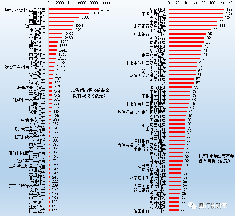 前100大銷售機(jī)構(gòu)中,銀行占31家,具體包括全部國(guó)有6大行;10家股份行(恒豐銀行和渤海銀行未入選);9家城商行(寧波銀行、上海銀行、北京銀行、江蘇銀行、南京銀行、杭州銀行、東莞銀行、華潤(rùn)銀行和青島銀行);4家外資行(匯豐銀行、渣打銀行、花旗銀行和恒生銀行)和2家農(nóng)商行(昆山農(nóng)商行和上海農(nóng)商行)。
