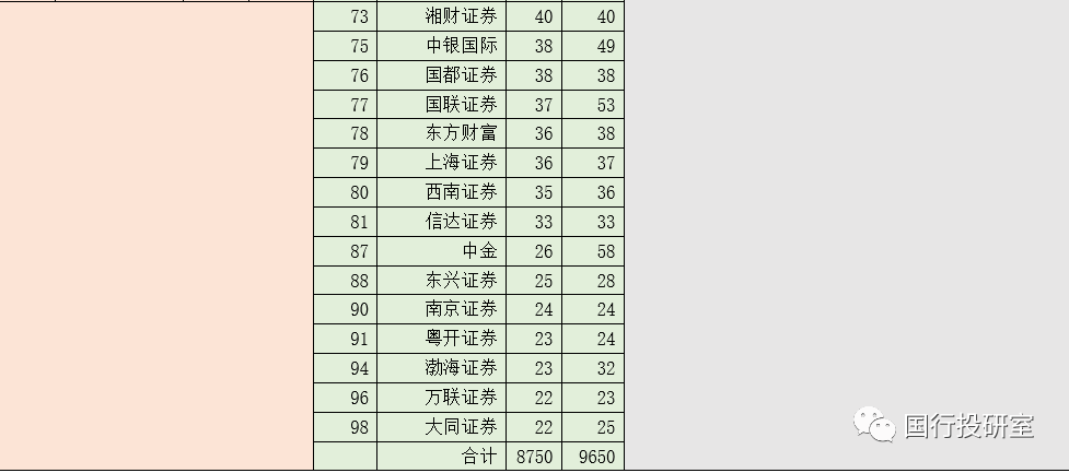 3、另有15家券商的保有規(guī)模超過100億元(合計(jì)達(dá)到3943億元、占全部47家券商的41%),從高到低依次為興業(yè)證券(448億元)、平安證券(405億元)、中信建投(390億元)、東方證券(352億元)、申萬宏源(293億元)、方正證券(290億元)、國(guó)泰君安證券(287億元)、安信證券(247億元)等。
