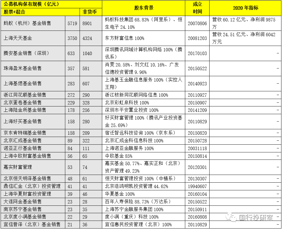 1、目前21家三方銷售機(jī)構(gòu)中,有3家機(jī)構(gòu)的非貨幣公募基金保有規(guī)模超過1000億元,合計(jì)達(dá)到14265億元、占全部21家機(jī)構(gòu)的81%。這3家機(jī)構(gòu)從高到低依次為螞蟻(杭州)基金銷售(8901億元)、上海天天基金(4324億元)和騰安基金銷售(1040億元)。即3家機(jī)構(gòu)分別為阿里系、東方財(cái)富系和騰訊系。