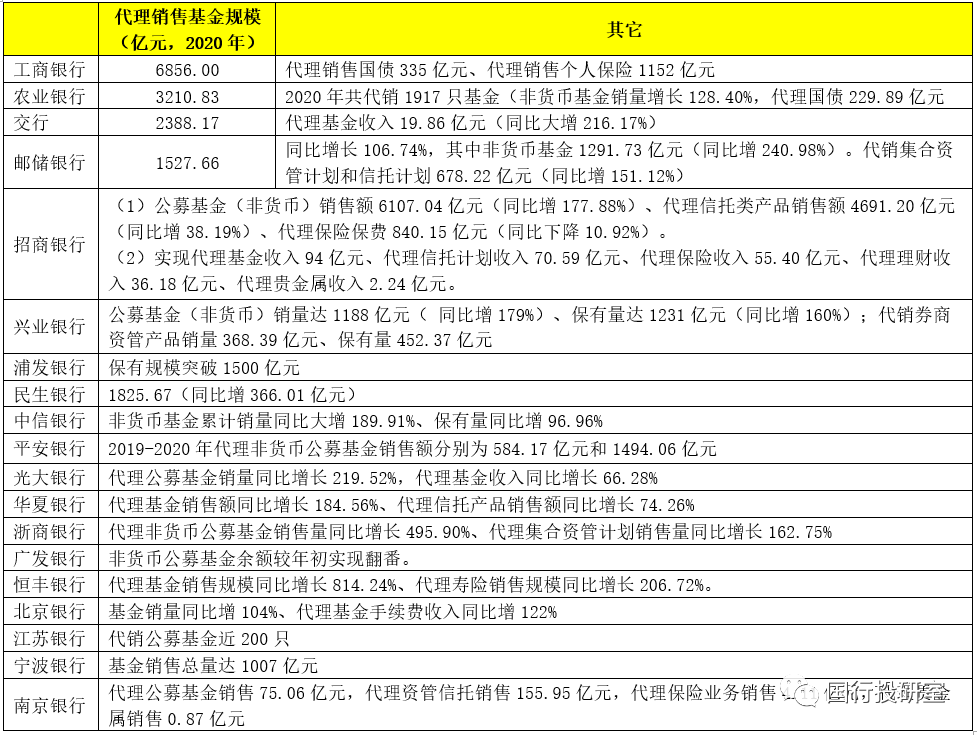 基金代銷、自營(yíng)理財(cái)以及代銷資管計(jì)劃、信托計(jì)劃、保險(xiǎn)等均是財(cái)富管理業(yè)務(wù)的有效組成部分,而基金代銷尤為受到重視,這主要和近兩年公募基金規(guī)模大幅增長(zhǎng)有關(guān)(如截至2021年5月20日,非貨幣公募基金的規(guī)模已增至12.84萬億,2018-2020年底分別為4.76萬億、7.29萬億和12.01萬億)。同時(shí)基金代銷業(yè)務(wù)亦相當(dāng)于銀行的個(gè)人客戶提供了投資權(quán)益類資產(chǎn)、涉足資本市場(chǎng)的有效渠道。