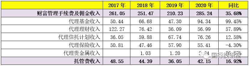 以招行為例,2020年招行財(cái)富管理業(yè)務(wù)貢獻(xiàn)的中收規(guī)模達(dá)到285.24億元,同比大幅增長(zhǎng)35.68%。其中,代理基金、代理理財(cái)、代理信托實(shí)現(xiàn)的收入分別高達(dá)94.34億元、56.99億元和76.26億元,同比分別增加99.45%、57.89%和12.58%。
