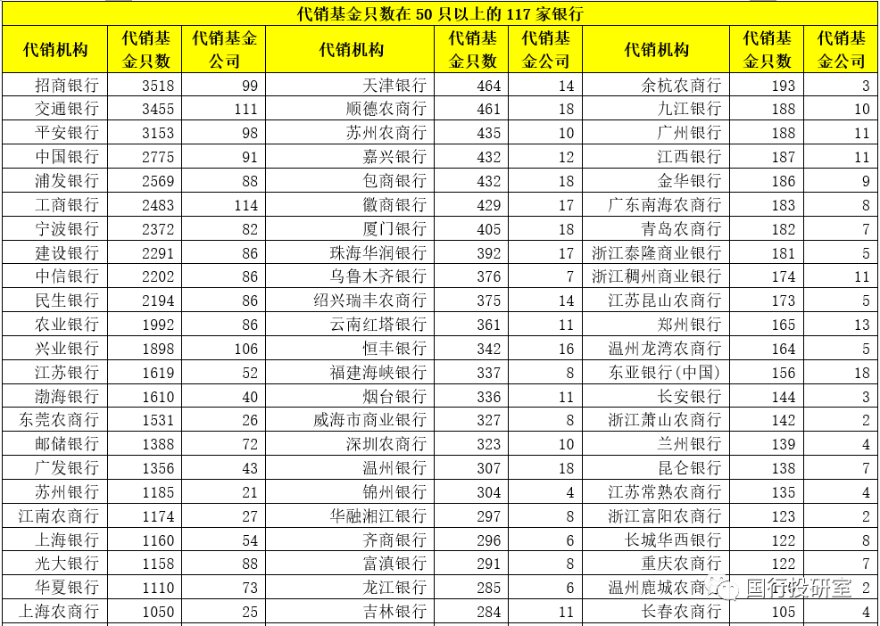 北京銀行、杭州銀行、微眾銀行、泉州銀行、東莞銀行、青島銀行、晉商銀行、南京銀行、北京農(nóng)商行、中原銀行、大連銀行、浙商銀行、西安銀行、天府銀行、河北銀行與哈爾濱銀行等16家銀行的代銷基金只數(shù)均超過500只。