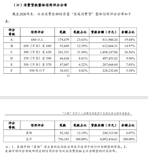 報告中還披露了興業(yè)消費金融消費貸款整體信用評分分布情況。興業(yè)消費金融目前使用的內(nèi)部評分,主要以客戶是否逾期作為因變量,客戶畫像特征作為自變量,運用邏輯回歸技術(shù)擬合和預(yù)測新客戶的違約可能性,總分區(qū)間在400- 700之間,評分越高,違約概率相對越低。