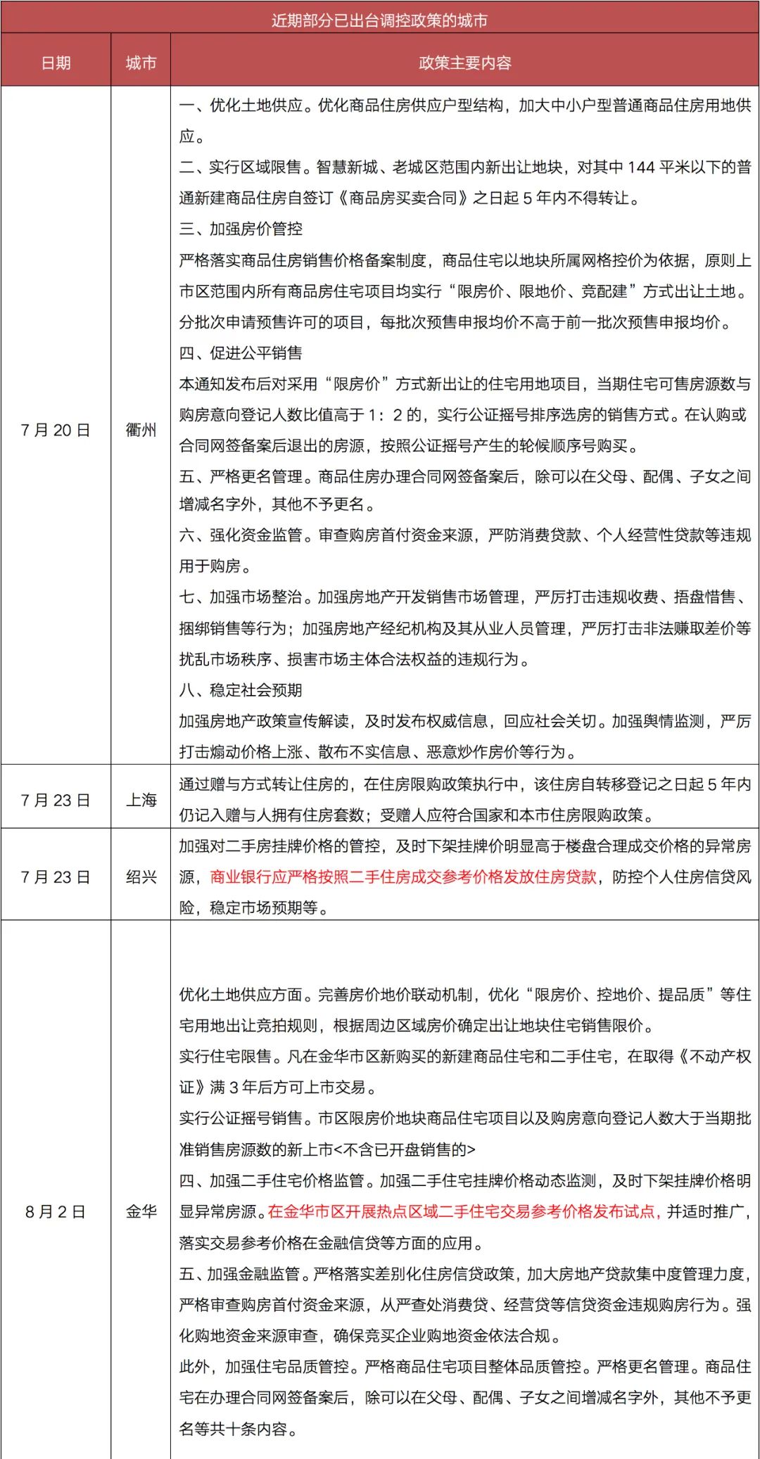 自7月23日住建部8部門發(fā)文以來,跟進(jìn)升級調(diào)控的城市中,紹興、金華、東莞、衢州明確了建立二手住房成交參考價格發(fā)布機(jī)制,商業(yè)銀行嚴(yán)格按照發(fā)布的二手住房成交參考價格為上限發(fā)放二手住房按揭貸款。