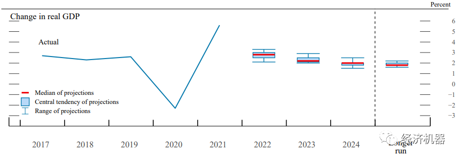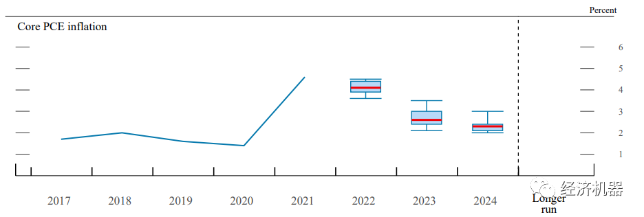 會(huì)議下調(diào)經(jīng)濟(jì)增速預(yù)期,上調(diào)通脹預(yù)期。會(huì)議GDP預(yù)測(cè)調(diào)低:預(yù)期2022年GDP增長2.8%,較上次4%的預(yù)測(cè)明顯有所回落;2023年增長2.2%,2024年增長2.0%,更長周期預(yù)計(jì)增長1.8%,與上一次預(yù)測(cè)持平。通脹預(yù)測(cè)調(diào)高:預(yù)期2022年P(guān)CE通脹率為4.3%,兩年回落至2.3%;上年預(yù)測(cè)PCE2.6%,兩年回落至2.1%。預(yù)期2022年核心PCE通脹率為4.1%,兩年回落至2.3%;上年預(yù)測(cè)核心PCE為2.7%,兩年回落至2.1%。失業(yè)率預(yù)期2022、2023年為3.5%,更長周期預(yù)期為4.0%,與此前持平。