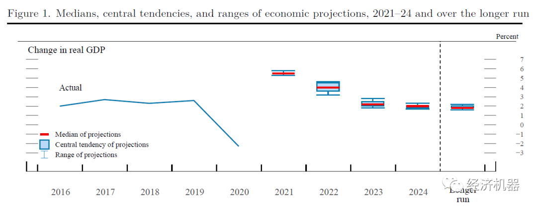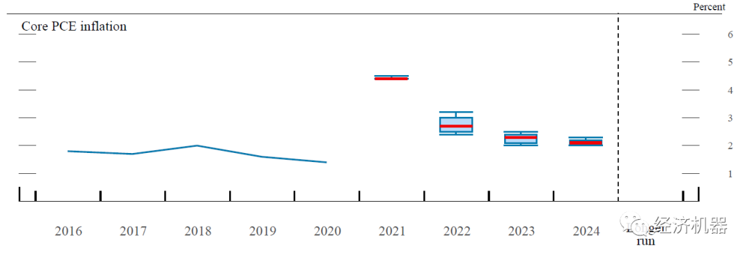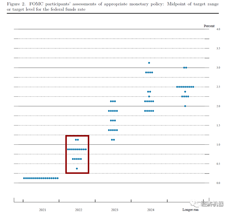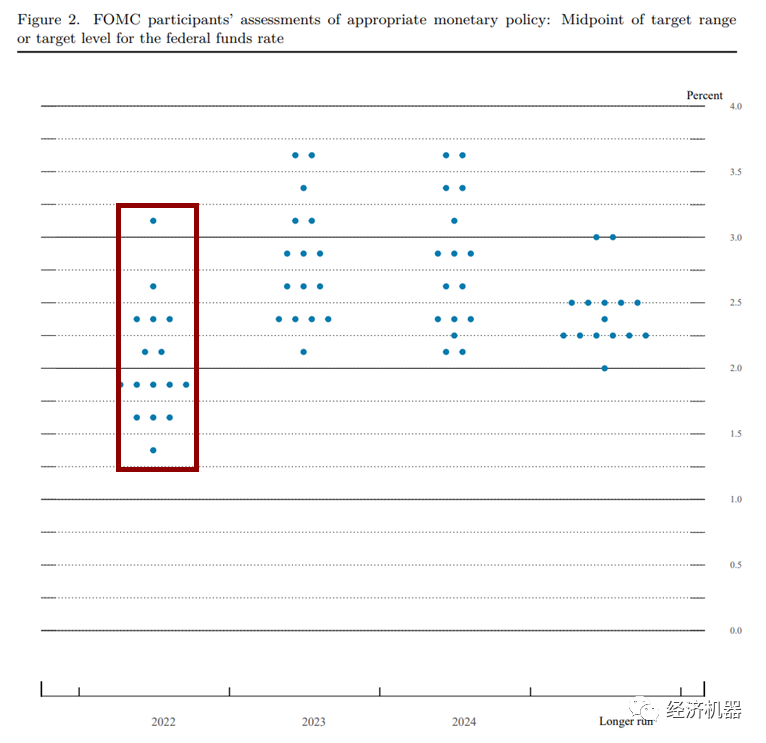 會(huì)議預(yù)測(cè)利率中樞抬升。會(huì)議預(yù)計(jì)2022年利率到1.9%(去年預(yù)測(cè)為0.9%),2023年年底利率將達(dá)到2.8%(去年為1.6%),2024年年底保持在2.8%(去年為2.1%),長期利率預(yù)期中值為2.4%(去年為2.5%)。整體利率中樞較12月有明顯提升。
