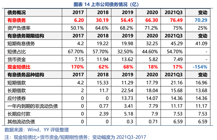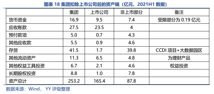 而集團(tuán)除去非上市公司部分資產(chǎn)主要集中在CCDI產(chǎn)業(yè)園項(xiàng)目和大數(shù)據(jù)園區(qū)綜合體項(xiàng)目,母公司資產(chǎn)主要為對上市公司的長投、和對文創(chuàng)置業(yè)(產(chǎn)業(yè)園項(xiàng)目的建設(shè)主體)的應(yīng)收款。最悲觀來看,市場擔(dān)憂成真,上市公司被無償劃出、大數(shù)據(jù)綜合園區(qū)項(xiàng)目后續(xù)去化乏力,公司還能獲得CCDI項(xiàng)目的政府補(bǔ)貼、加上已預(yù)售的回款和貨幣資金及理財(cái)產(chǎn)品,大致能覆蓋母公司層面有息債務(wù);樂觀來看,若上市公司還在集團(tuán)手里(或轉(zhuǎn)移獲得一定對價(jià)),則能大幅減少償債壓力。