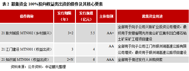 截至11月30日,存量權(quán)益出資型票據(jù)共計34只,規(guī)模336.5億元,其中城投公司發(fā)行的數(shù)量共計21只,規(guī)模190.5億元,共涉及18家發(fā)行主體。在上述18家城投公司中,AAA級、AA+級、AA級的數(shù)量分別為8家、9家、1家,對應(yīng)的權(quán)益出資型票據(jù)存量規(guī)模分別為130億元、56.5億元、4億元,集中在高信用級別的特征尤為顯著。從募集資金用途來看,較多地集中在對子公司增資(并用作項目資本金)、償還并購貸款等,其中有3只債券(為中票)的募集資金100%投向權(quán)益類出資(詳見表2),有12只債券(為中票)中則有部分資金用于償還有息債務(wù),剩余6只債券(為PPN)則未披露募集資金用途。從發(fā)行期限來看,考慮含權(quán)因素的話,最長期限是不確定期限,也即長期存續(xù),但這種情況僅有兩例;不考慮含權(quán)因素的話,最長期限為5年,超八成均為3年期,低于理論預期水平,顯示投資者對更長期限權(quán)益出資票據(jù)的接受度不高。作為創(chuàng)新品種,其募集資金用于權(quán)益類投資,而權(quán)益類投資本身具有高風險性,這與債券投資者低風險偏好的特點相悖,這是5年以上甚至長期存續(xù)型權(quán)益出資票據(jù)較難發(fā)出來的根源所在。