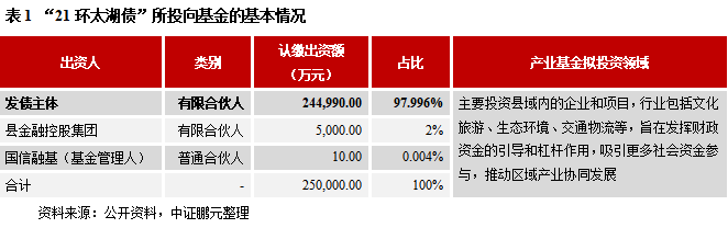 截至11月30日,存量基金債共計60只,規(guī)模746.92億元,其中城投公司發(fā)行的數(shù)量共計24只,規(guī)模255.21億元,共涉及17家發(fā)行主體。在上述17家城投公司中,AAA級、AA+級、AA級的數(shù)量分別為9家、6家、2家,對應(yīng)的存量基金債規(guī)模分別為166.01億元、74.2億元、15億元,集中在高信用級別的特征十分顯著。從募集資金用途來看,較多地集中在對產(chǎn)業(yè)基金等出資、增資或繳納公司已成立基金的出資額,其中有19只債券的募集資金100%投向產(chǎn)業(yè)基金或直接用于股權(quán)投資(比如浙江省湖州市某縣級城投公司所發(fā)的8億元基金債——“21環(huán)太湖債”,詳見表1),剩余4只債券中則有部分資金用于補充營運資金或者投向建設(shè)項目。