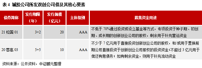 截至11月30日,存量雙創(chuàng)公司債券共計66只,規(guī)模377.62億元,其中城投公司發(fā)行的數(shù)量共計13只,規(guī)模102.35億元,共涉及12家發(fā)行主體。在上述12家城投公司中,AAA級、AA+級、AA級的數(shù)量分別為6家、4家、2家,對應(yīng)的雙創(chuàng)專項債務(wù)融資工具存量規(guī)模分別為73億元、22.35億元、7億元(私募),呈現(xiàn)出向高信用級別集中的特征。需要提示的是,目前存量雙創(chuàng)公司債中城投公司的發(fā)行占比偏小,這與最初發(fā)行指引中對發(fā)行主體的設(shè)定有關(guān),今年7月經(jīng)修訂后發(fā)行主體擴容,由城投公司作為發(fā)行主體的雙創(chuàng)公司債規(guī)模有望增大。從募集資金用途來看,城投公司所發(fā)雙創(chuàng)公司債的資金主要通過直接投資或設(shè)立基金等方式,專項投資于雙創(chuàng)公司股權(quán),少部分(不超過30%)用于補充營運資金、償還有息債務(wù)(見表4)。