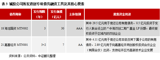 截至11月30日,存量雙創(chuàng)專項債務(wù)融資工具共計26只,規(guī)模287.1億元,其中城投公司發(fā)行的數(shù)量共計22只,規(guī)模221.1億元,共涉及16家發(fā)行主體。在上述16家城投公司中,AAA級、AA+級、AA級的數(shù)量分別為6家、6家、4家,對應(yīng)的雙創(chuàng)專項債務(wù)融資工具存量規(guī)模分別為120.6億元、80億元、20.50億元,呈現(xiàn)出向高信用級別集中的特征。從募集資金用途來看,大部分資金均投向常規(guī)用途(如償還有息債務(wù)、雙創(chuàng)基地項目建設(shè)等),僅有較小部分用于向創(chuàng)新型企業(yè)開展股權(quán)投資,這主要是受到了股權(quán)投資占比30%上限的約束,不過實際上也有一些城投公司發(fā)行雙創(chuàng)專項債務(wù)融資工具時突破了該限制(詳見表3)。另外,有不少債券在命名時未體現(xiàn)“雙創(chuàng)”,但從募集說明書的信息披露及資金投向來看,其確實屬于雙創(chuàng)專項債務(wù)融資工具,比如“19德陽經(jīng)開MTN001”,其發(fā)行規(guī)模為3.5億元,其中3.15億元用于償還發(fā)行人本部及其控股子公司銀行借款、租賃融資、PPN利息,0.35億元用于向入駐德陽經(jīng)開區(qū)的雙創(chuàng)企業(yè)(四川德陽金士能新材料有限公司)開展股權(quán)投資,用于股權(quán)投資的占比為10%,低于30%的監(jiān)管上限。
