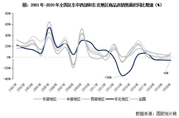1、東北銷售面積增速自2010年來(lái)急跌緩增,2018年起連續(xù)3年負(fù)增長(zhǎng)