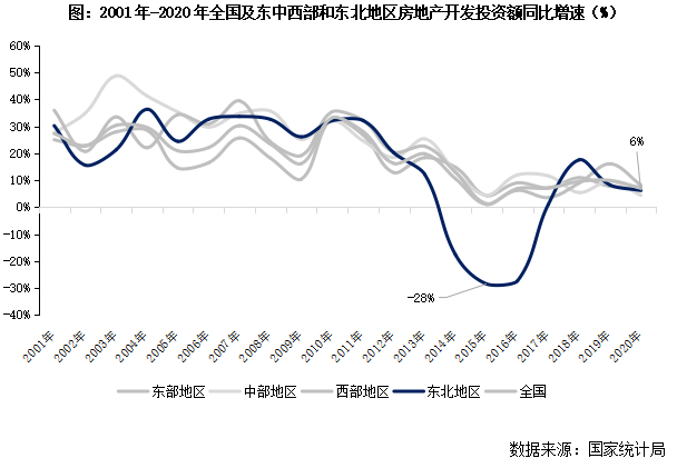 2010年后東北地區(qū),包括遼寧、吉林、黑龍江3省,房地產(chǎn)發(fā)展逐漸偏離全國(guó)主航道。不僅開(kāi)發(fā)投資額增速自2014年以來(lái)進(jìn)入負(fù)增長(zhǎng)區(qū)間,行業(yè)銷售規(guī)模也常年低于東中西部地區(qū),自2018年起已連續(xù)3年負(fù)增長(zhǎng)。
