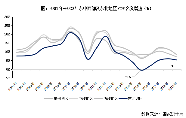 經(jīng)濟(jì)層面,東北地區(qū)GDP增速大幅落后其他地區(qū)。隨著國(guó)民經(jīng)濟(jì)的發(fā)展,東北地區(qū)普遍以傳統(tǒng)重工業(yè)為主的第二產(chǎn)業(yè)對(duì)整體經(jīng)濟(jì)增長(zhǎng)的支撐愈發(fā)有限。隨著地區(qū)資源逐漸枯竭,產(chǎn)能落后下東北地區(qū)GDP名義增速自2012年起逐步下行,2015年甚至同比負(fù)增長(zhǎng)1%。至2019年雖有所回升,但GDP名義增速僅5%,大幅落后于東中西部地區(qū)。