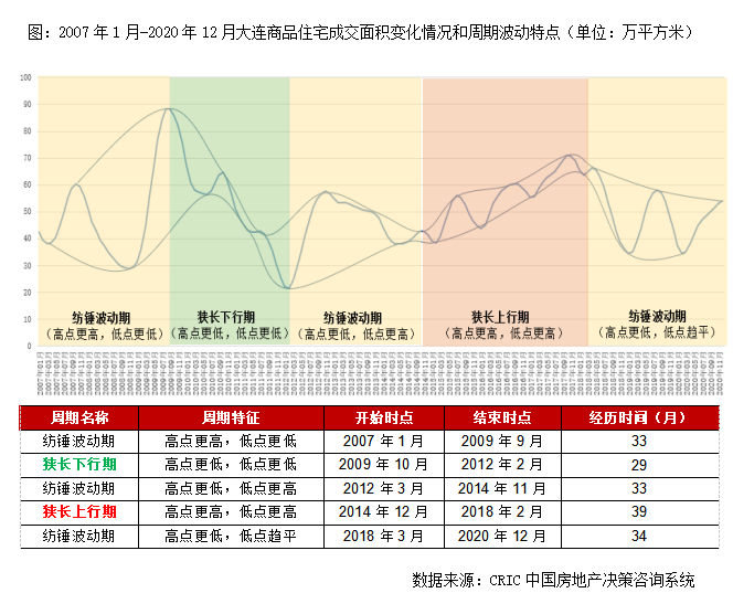 大連市場(chǎng)發(fā)展總體可分為兩個(gè)階段,2011年之前為“大漲大跌”的劇烈波動(dòng)期,2012年之后高位持穩(wěn),波動(dòng)加劇,波幅減小。而細(xì)化到月度數(shù)據(jù),可以看出大連成交變動(dòng)每一個(gè)波段周期基本都持續(xù)在30-40個(gè)月之間,即3年為一周期,紡錘波動(dòng)期和狹長(zhǎng)上&下行周期緊密相連。