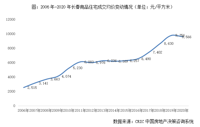 房?jī)r(jià)層面,長(zhǎng)春商品住宅成交均價(jià)如大連一樣,也呈現(xiàn)出“階梯性”爬升特點(diǎn):2017-2010年逐年遞增至房?jī)r(jià)破5000元/平方米,2011-2016年高位持穩(wěn)在6000元/平方米,并無(wú)太大波動(dòng),2017年開(kāi)始進(jìn)入新一輪爬升,2019年再度達(dá)到階段性高點(diǎn),商品住宅成交均價(jià)高位維持在9756元/平方米,2020年小幅微降至9566元/平方米,至今房?jī)r(jià)尚未破萬(wàn)。
